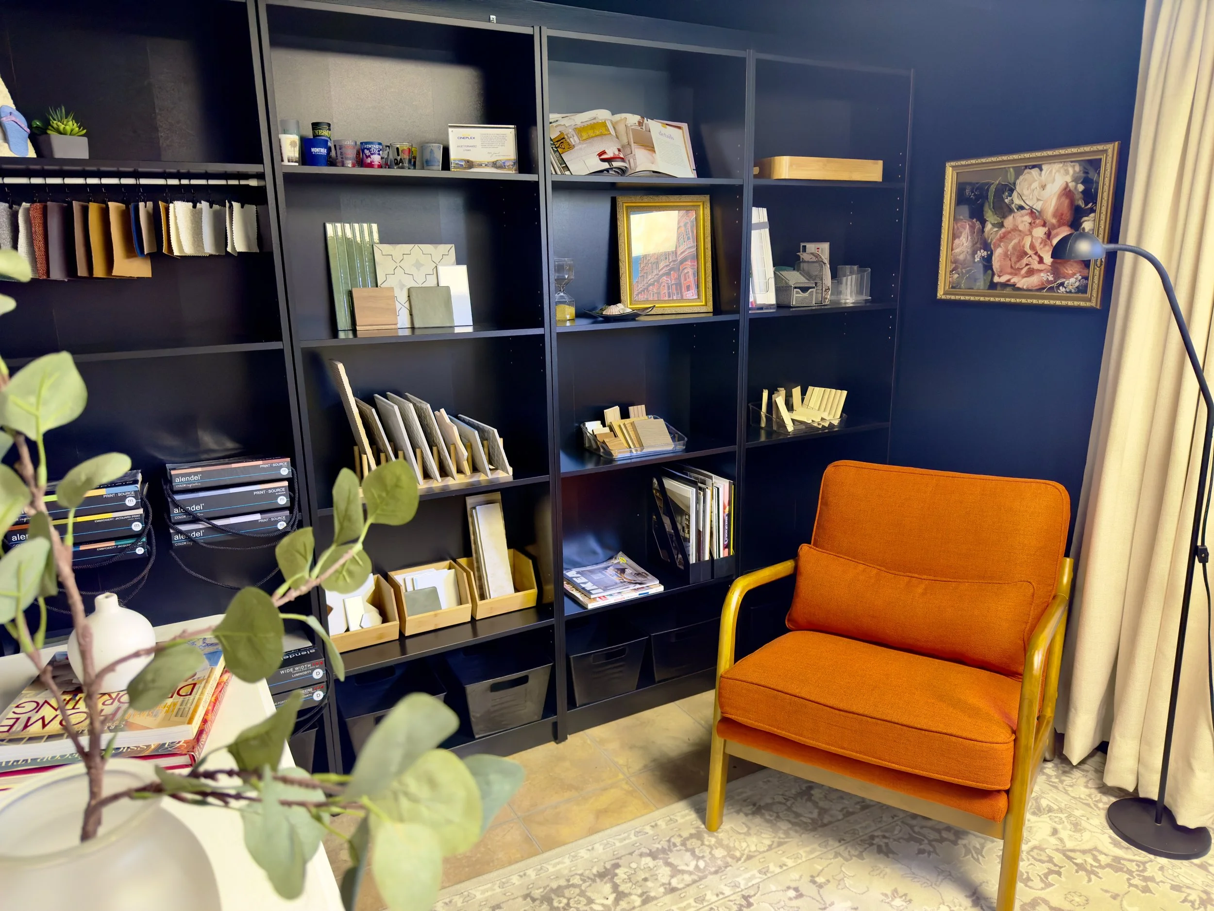 The result is a workspace designed around how a designer actually works: a large desk with dedicated monitor space, a curated display of finish samples and materials, and a reading and relaxation corner for the moments between client work. The design is aligned with the Inspired Spaces brand identity — intentional, polished, and a little bit bold.